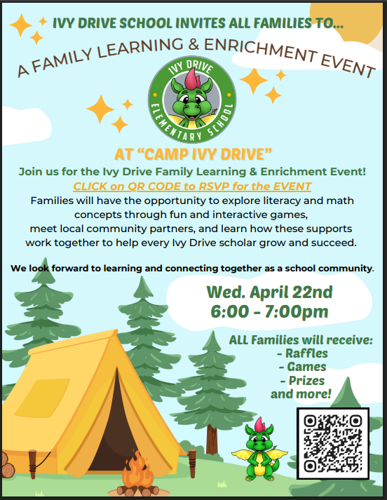 Dear Ivy Drive Families,We are excited to invite you to our Family Learning & Enrichment Event - "Camp Ivy Drive" on Wednesday, April 22 from 6:00–7:00 PM at Ivy Drive School!This special eveni...