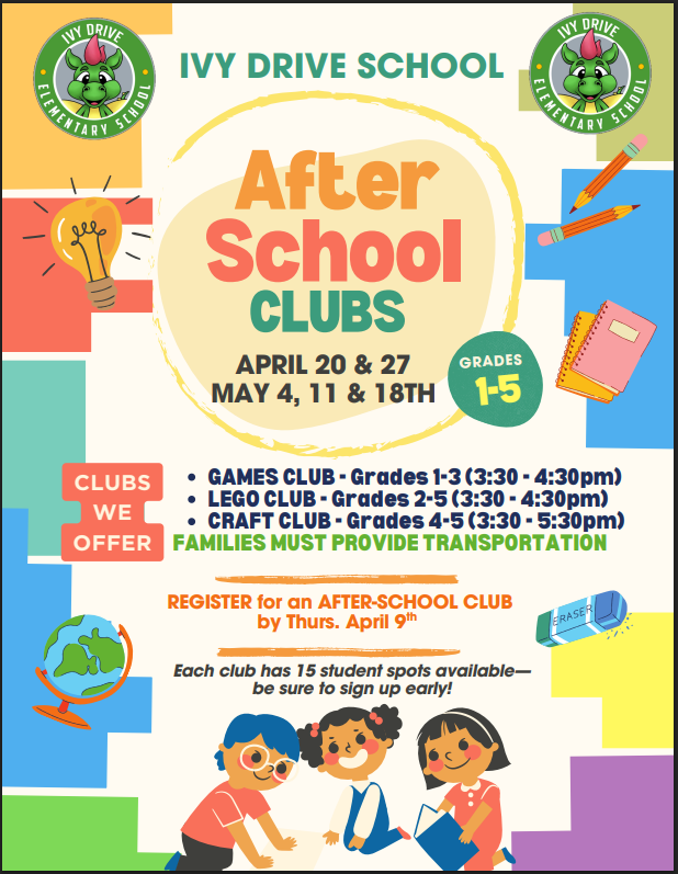 Good Morning, Ivy Drive School Community,I am excited to share a new after-school club opportunity available to our Ivy Drive students in grades 1 through 5!Beginning Monday, April 20, we will be o...