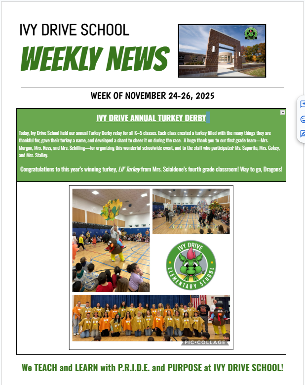 As we head into the holiday weekend, I want to extend my heartfelt thanks to all of our Ivy Drive families and our entire school community. I am grateful for the opportunity to work alongside such dedicated and caring staff and families who work tirelessly to support our students in achieving their very best. I am truly thankful for the PRIDE our community shows each and every day. Wishing you a wonderful Thanksgiving with your family and loved ones.